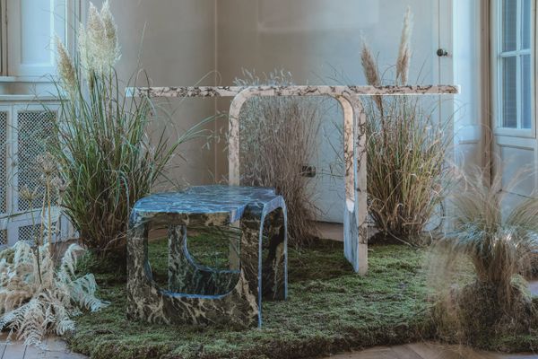 The second action consists in achieving the imaginary bending of a material that is impossible to fold, the stone. The top of the console remains parallel to the ground and still joined to two sets of legs laterally. While these are doubled from the table top until reaching the perpendicularity with it.